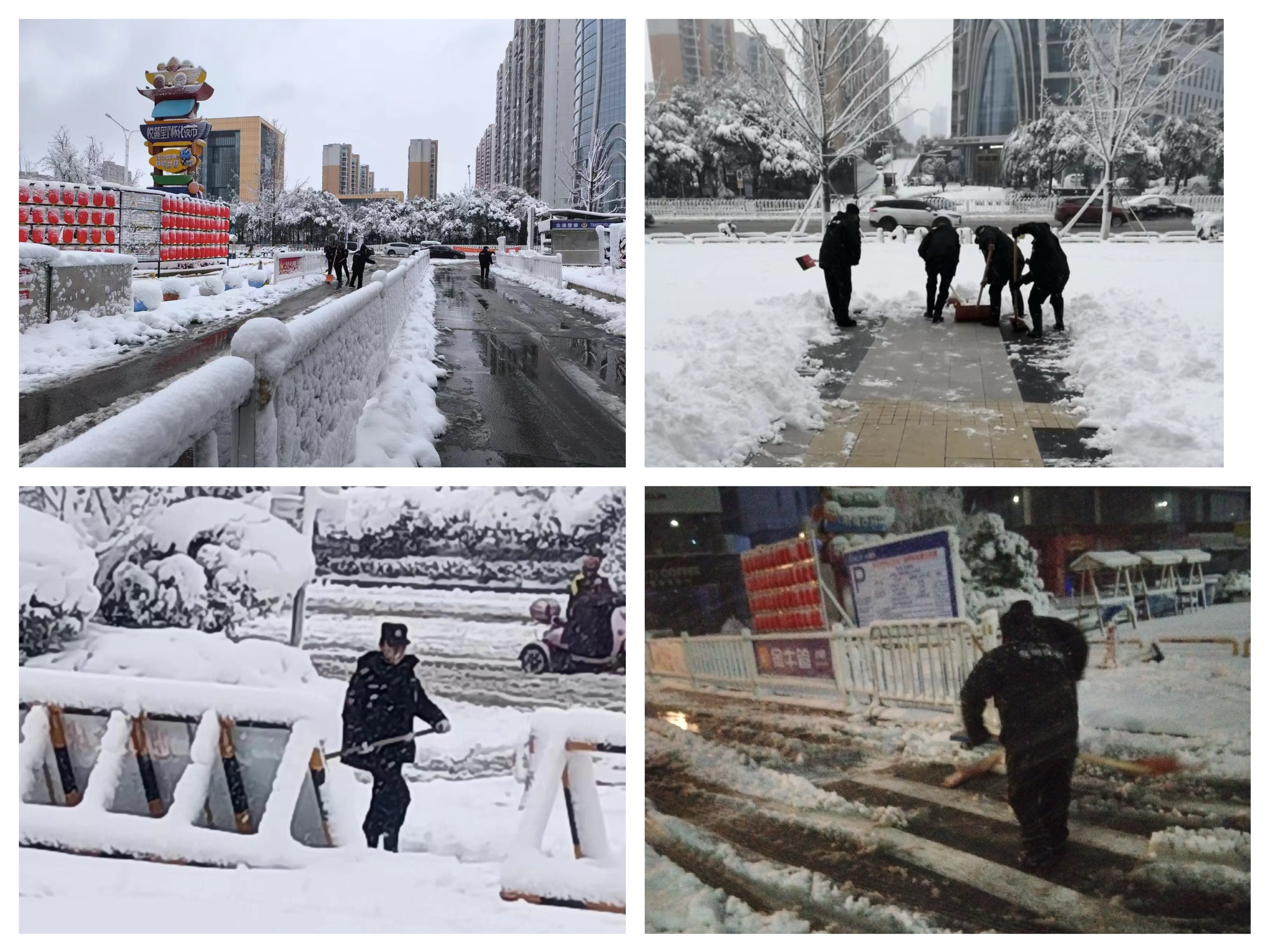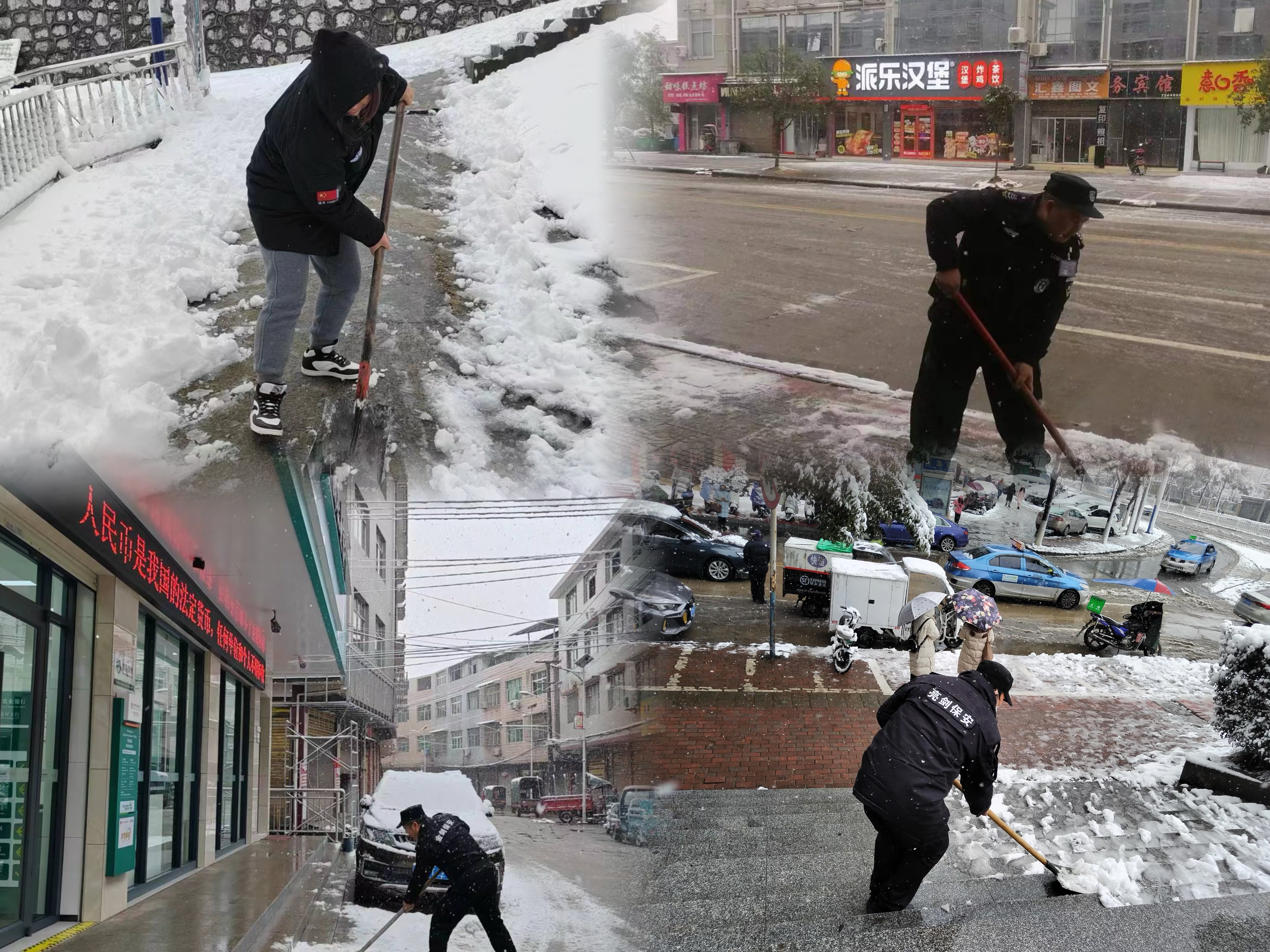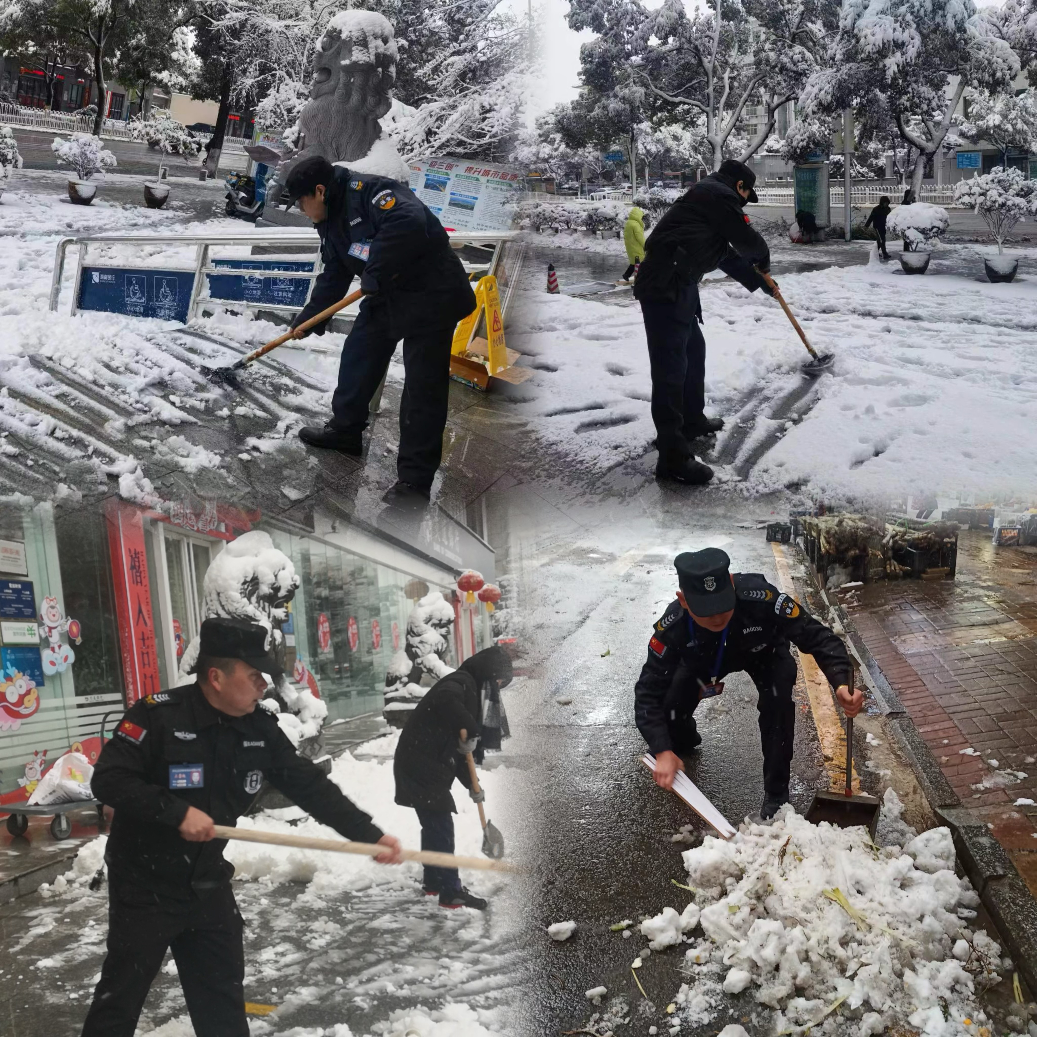 活動現(xiàn)場,參與保安隊員不畏風寒、熱情高漲,手握鐵鍬、掃把等工具,齊心協(xié)力、默契配合,迅速將服務點門口及附近的路面積雪清理完畢。