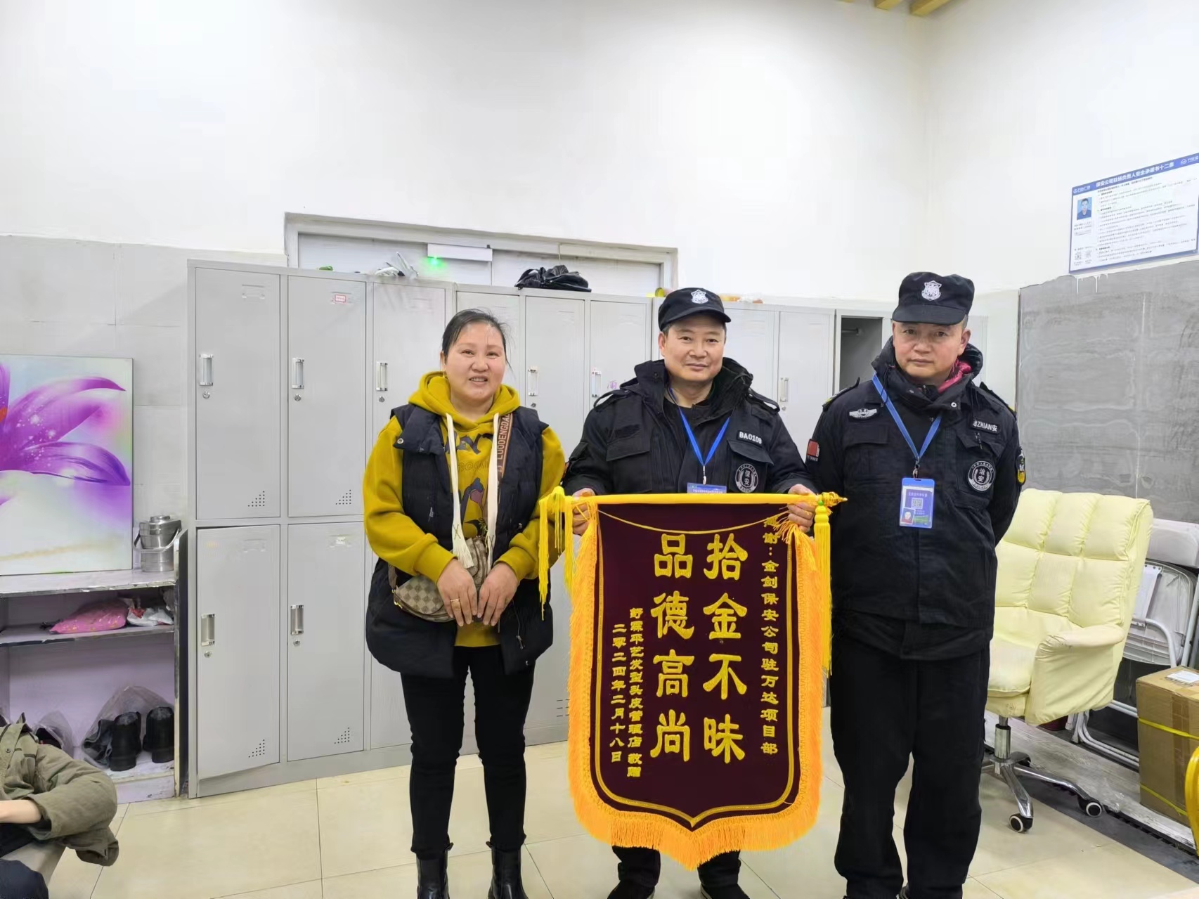 2月17日,失主武曉蘭通過電話聯(lián)系佳惠超市服務(wù)臺了解到丟失的錢包被懷化金劍保安公司駐萬達(dá)保安隊隊員彭滿娃拾得并放置在佳惠服務(wù)臺,激動萬分,遂連夜制作了錦旗,于2024年2月18日清早從溆浦趕往懷化,將錦旗親手送到了彭滿娃手中,對彭滿娃同志的這種拾金不昧行為表達(dá)感謝,對彭滿娃的這種高尚品德表達(dá)欽佩。